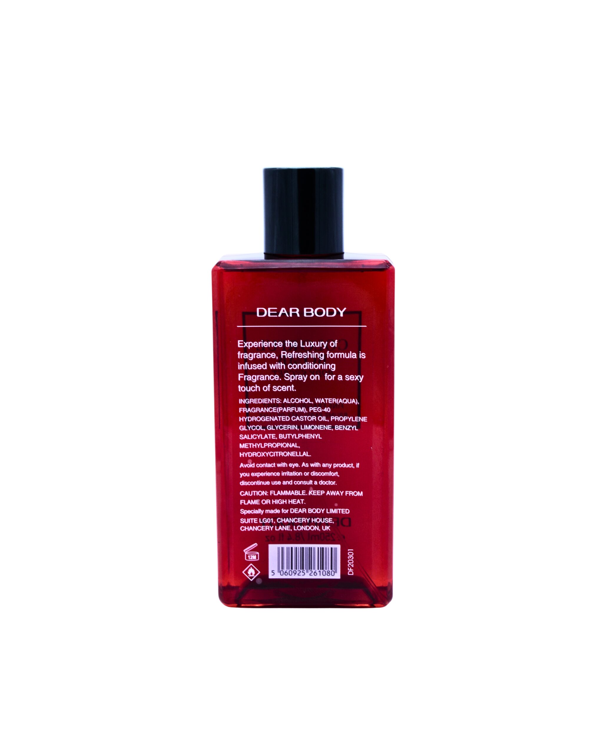 Ergonomic Luxury Packaging: The sleek, tall rectangular bottle fits perfectly in the hand, while the minimalist labeling reflects the modern, high-end aesthetic of the Dear Body London line.